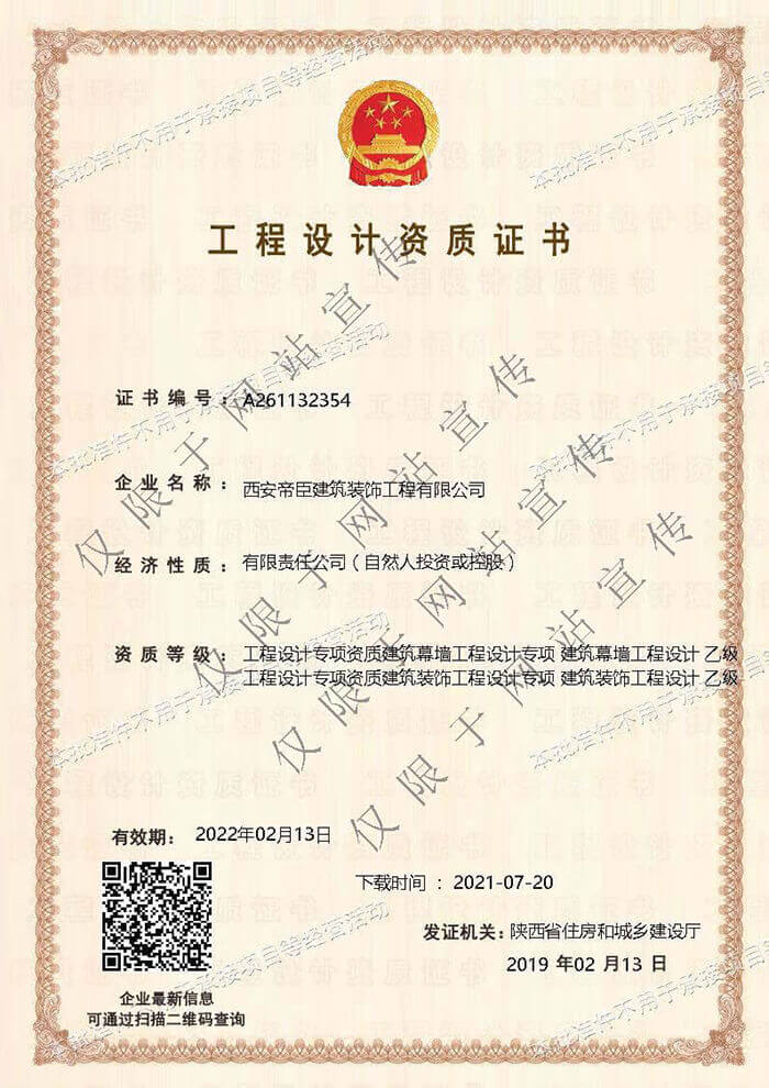 公司成立以來已成為建設(shè)部核準(zhǔn)的建筑裝修裝飾工程專業(yè)承包 一級、防水防腐保溫工程專業(yè)承包 二級、建筑機(jī)電安裝工程專業(yè)承包 三級、鋼結(jié)構(gòu)工程專業(yè)承包 三級、建筑幕墻工程專業(yè)承包 二級、消防設(shè)施工程專業(yè)承包 二級、環(huán)保工程專業(yè)承包 三級、建筑工程施工總承包 三級、機(jī)電工程施工總承包 三級、工程設(shè)計專項資質(zhì)建筑幕墻工程設(shè)計專項 建筑幕墻工程設(shè)計 乙級、工程設(shè)計專項資質(zhì)建筑裝飾工程設(shè)計專項 建筑裝飾工程設(shè)計 乙級的裝飾企業(yè)……